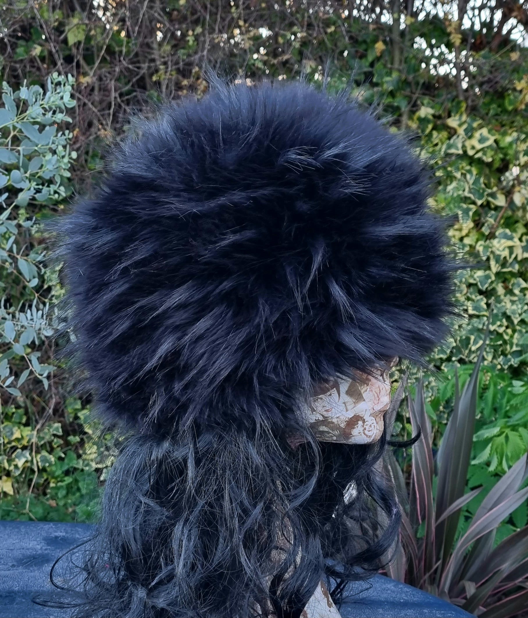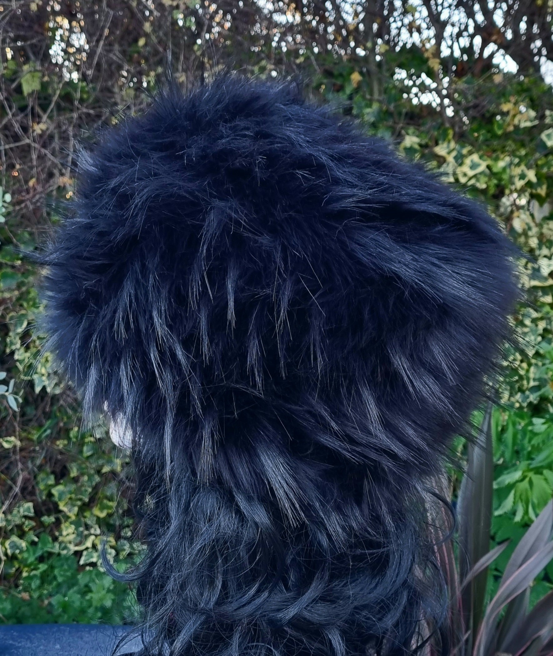 A long pile fluffy black faux fur hat.