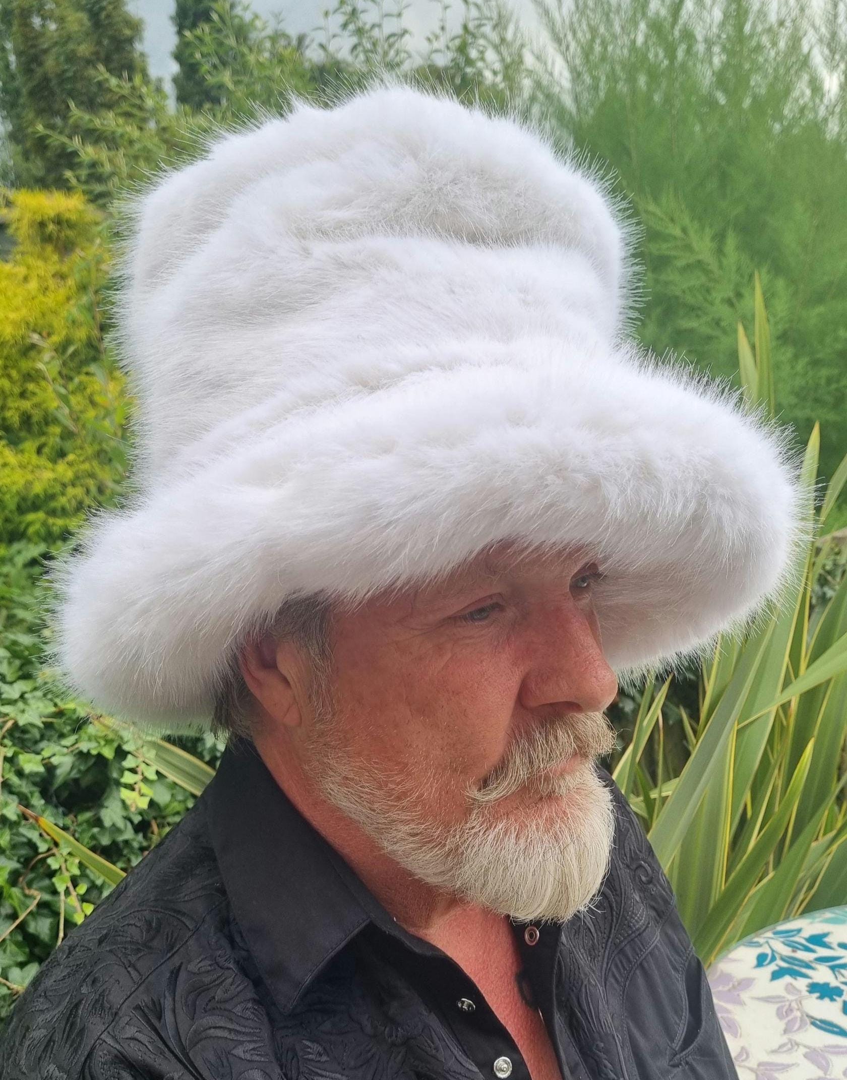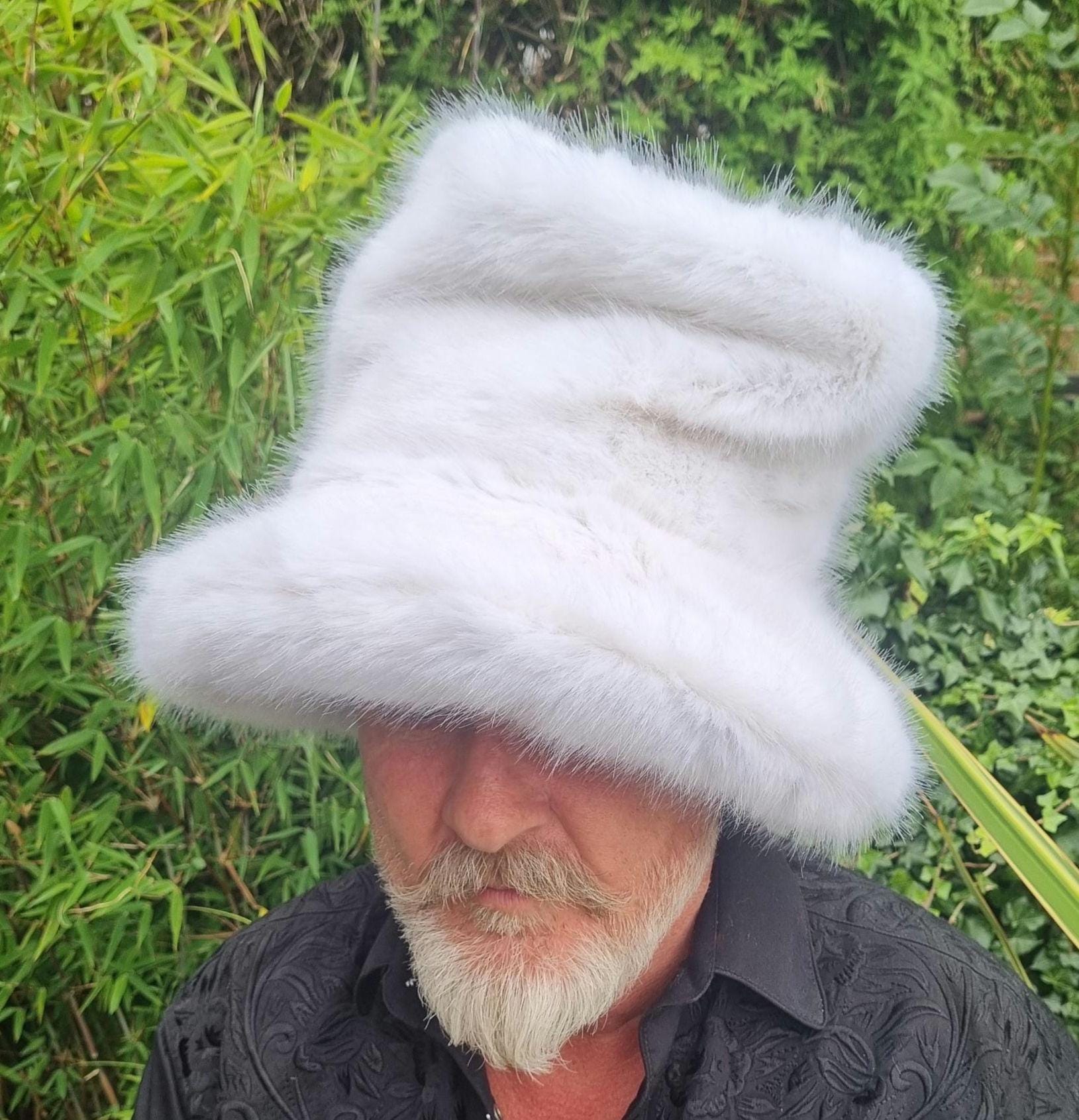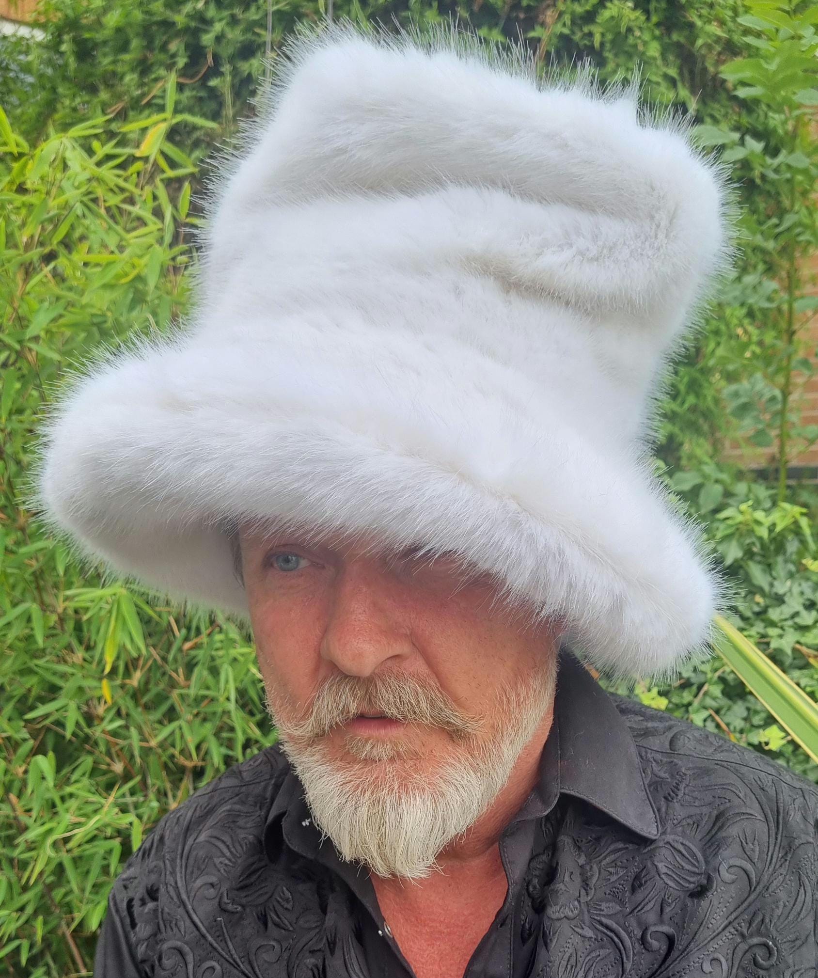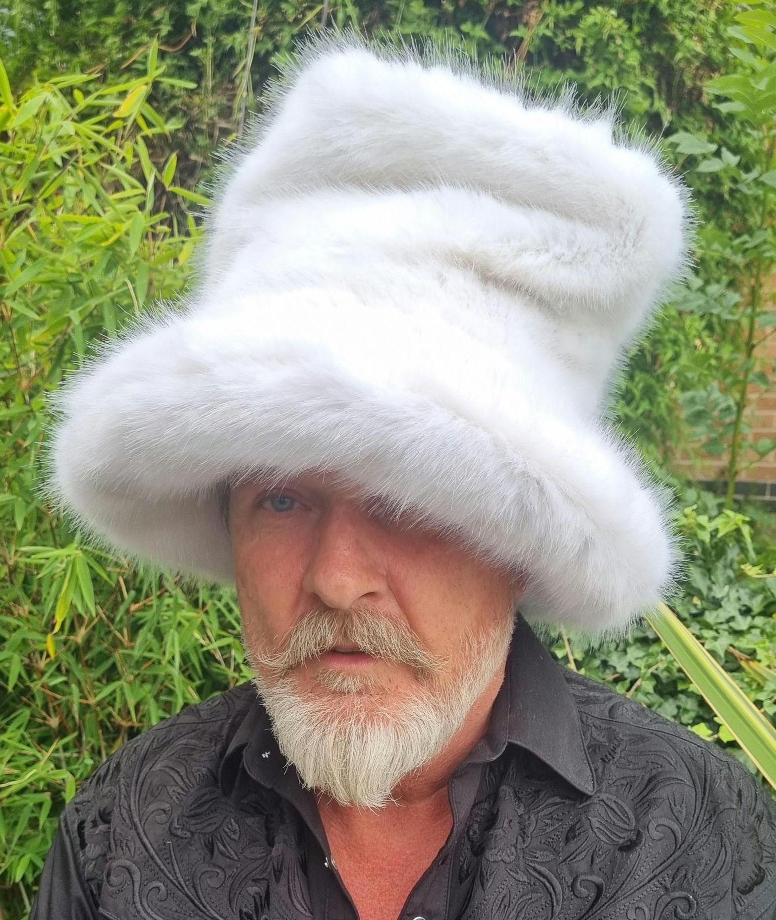 An absolutely GORGEOUS tall hat in super luxury, white fur fabric.