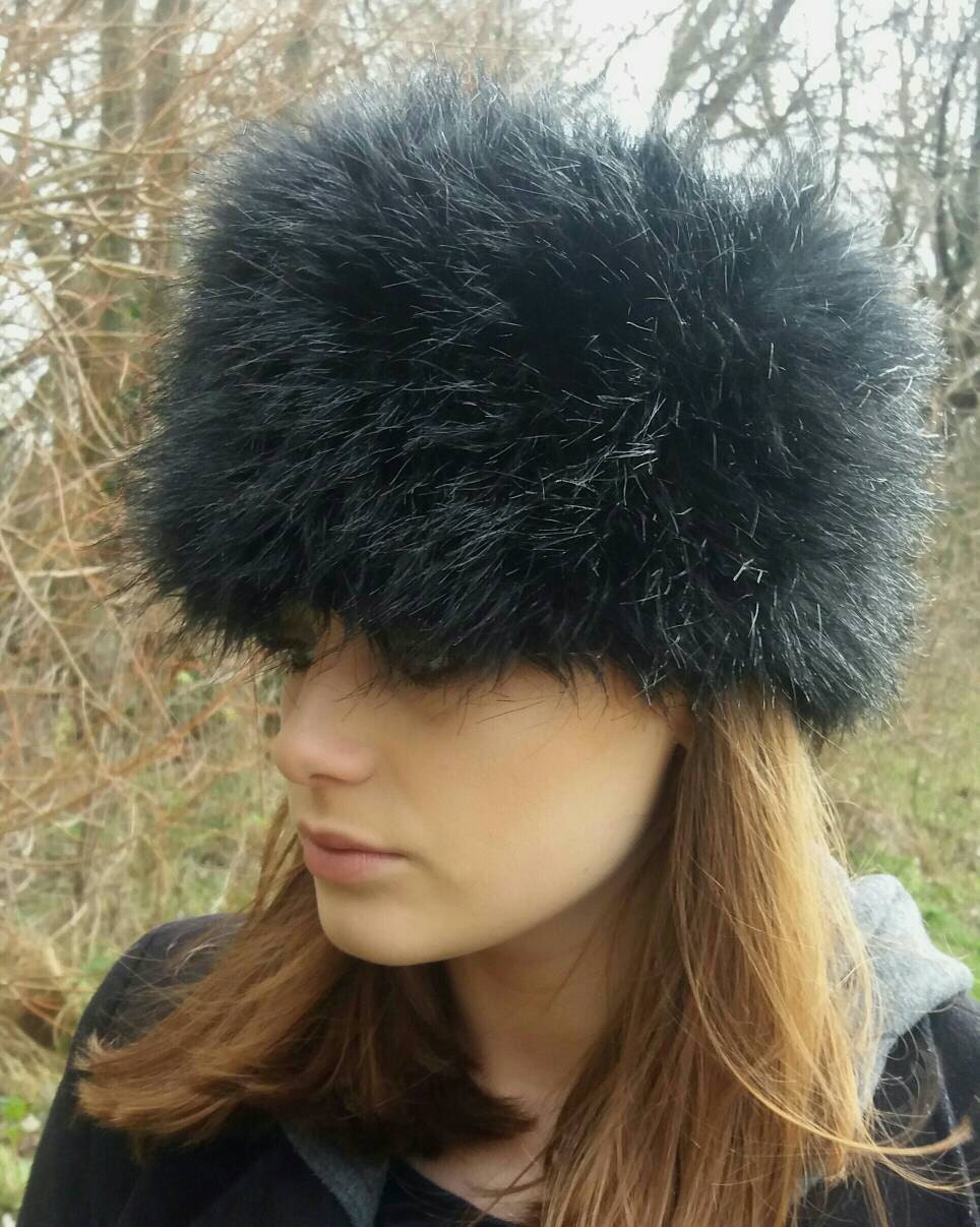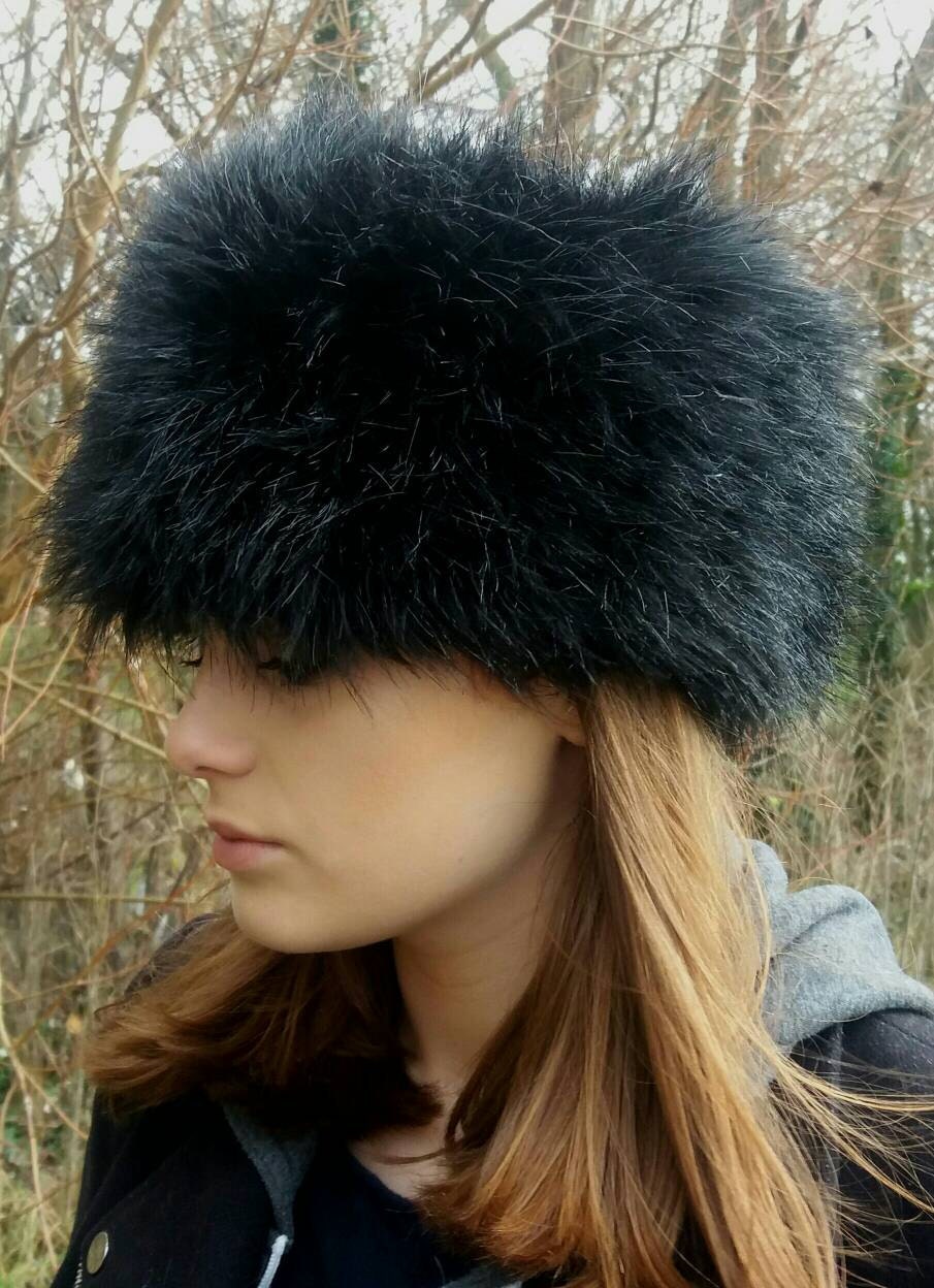 A lovely plain black faux fur hat with pile approx 1 inch long.