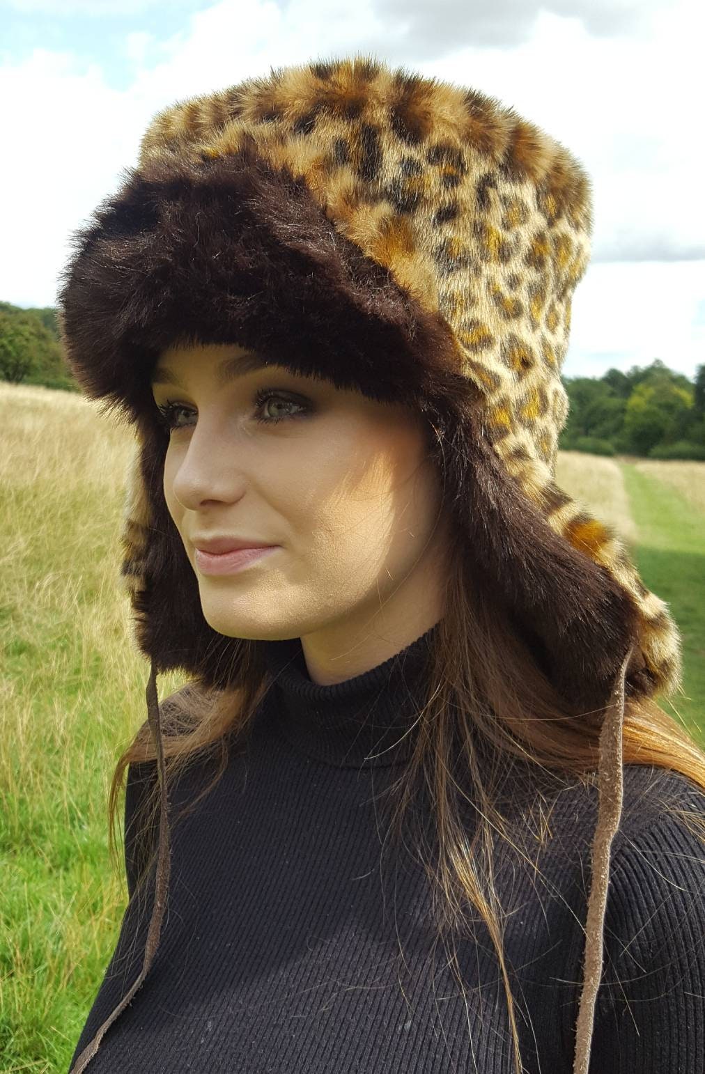 Lovely Leopard print faux fur with chocolate brown faux fur and fleece lining.