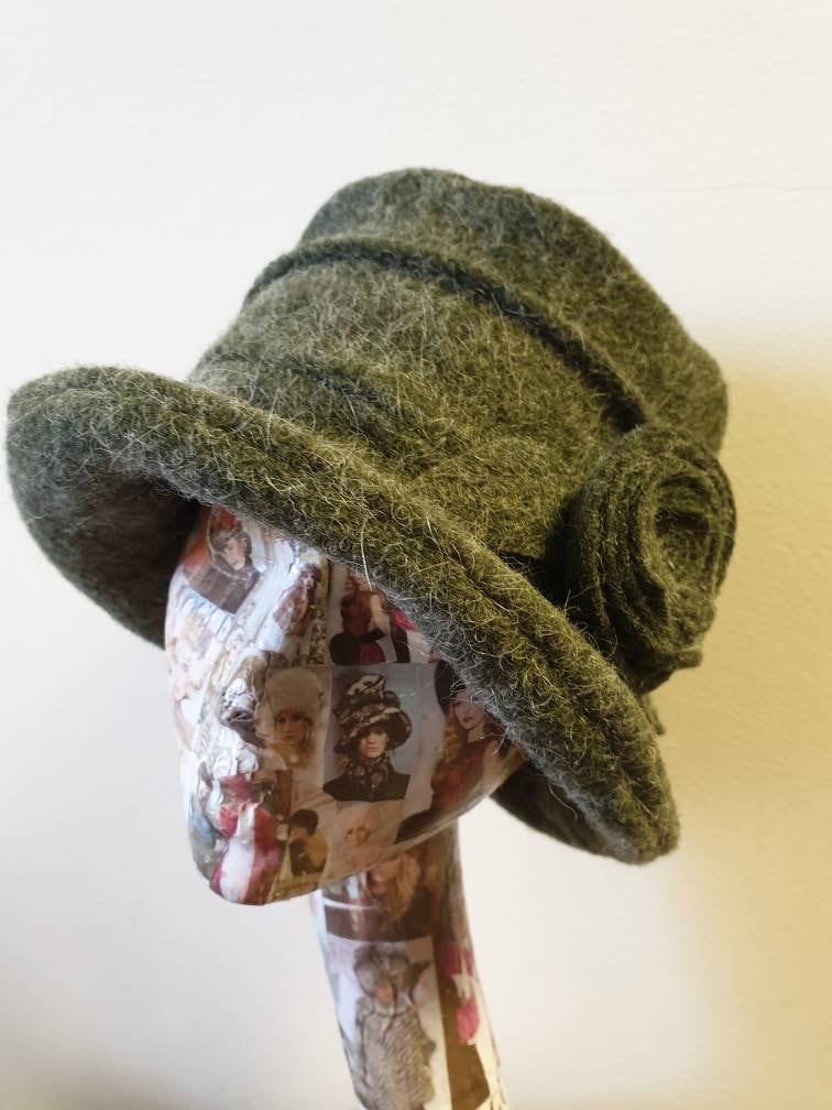 Khaki Green wool blend hat with flower trim.